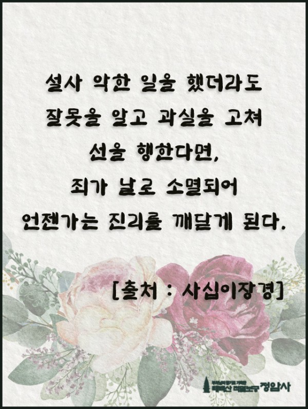 _()_ 붓다의 말씀 2024년 12월 - 설사 악한 일을 했더라도 페이지 정보 작성자 정암사 작성일24-11-28 19:37 조회4,746회 댓글0건 본문 . 댓글목록 등록된 댓글이 없습니다. 이전글 다음글 목록