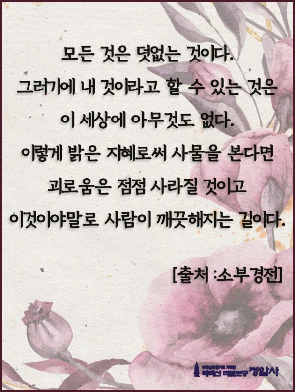 _()_ 붓다의 말씀 2024년 1월 - 모든 것은 덧없는 것이라 페이지 정보 작성자 정암사 작성일23-12-31 09:38 조회7,535회 댓글0건 본문 . 댓글목록 등록된 댓글이 없습니다. 이전글 다음글 목록