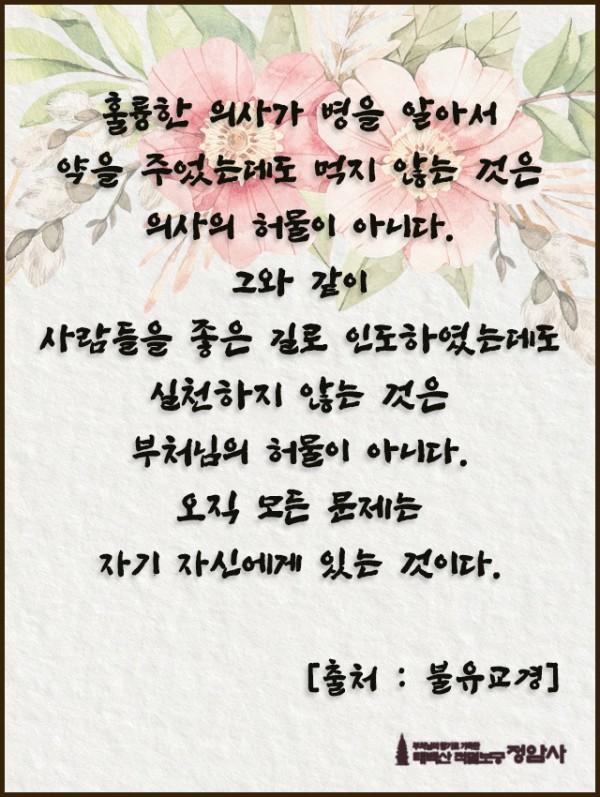 _()_ 붓다의 말씀 2024년 10월 - 훌륭한 의사가 병을 알아서 페이지 정보 작성자 정암사 작성일24-09-30 14:47 조회4,976회 댓글0건 본문 . 댓글목록 등록된 댓글이 없습니다. 이전글 다음글 목록