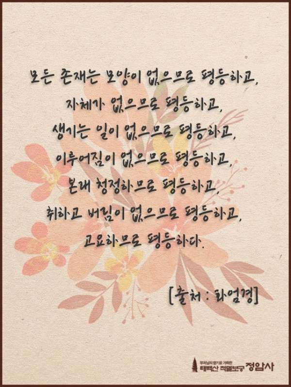_()_ 붓다의 말씀 2022년 9월 - 모든 존재는 모양이 없으므로 평등하고 페이지 정보 작성자 정암사 작성일22-08-29 16:04 조회8,019회 댓글0건 본문 . 댓글목록 등록된 댓글이 없습니다. 이전글 다음글 목록
