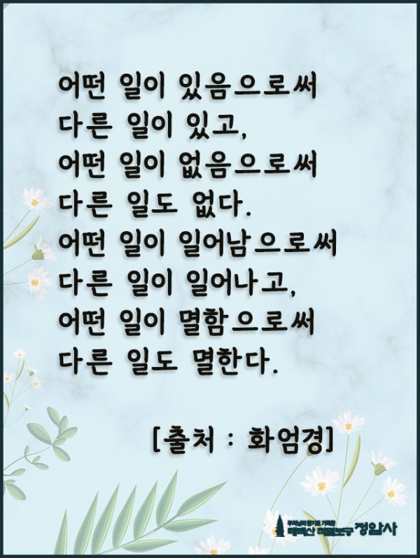 _()_ 붓다의 말씀 2023년 6월 - 어떤 일이 있음으로써 다른 일이 있고 페이지 정보 작성자 정암사 작성일23-05-26 18:18 조회7,218회 댓글0건 본문 . 댓글목록 등록된 댓글이 없습니다. 이전글 다음글 목록