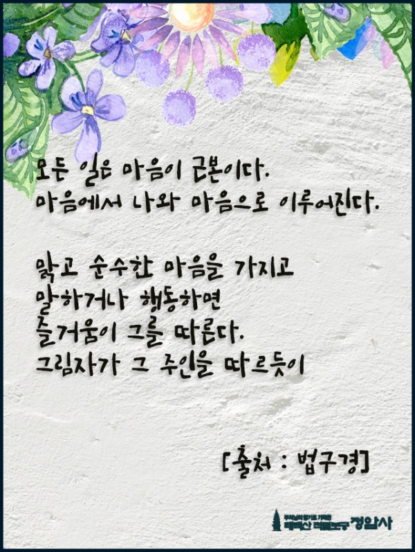 _()_ 붓다의 말씀 2023년 7월 - 모든 일은 마음이 근본이다 페이지 정보 작성자 정암사 작성일23-06-29 22:22 조회7,099회 댓글0건 본문 . 댓글목록 등록된 댓글이 없습니다. 이전글 다음글 목록