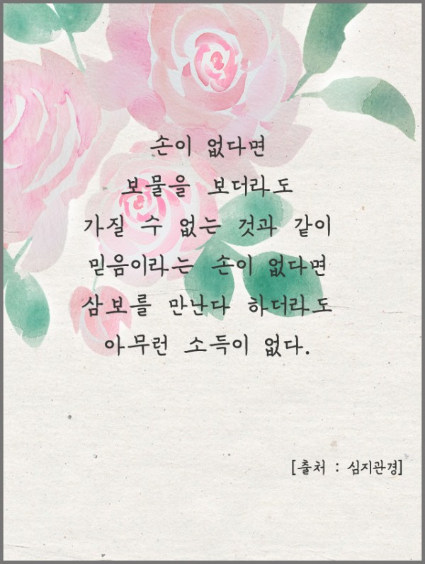 _()_ 붓다의 말씀 2021년 6월 - 손이 없다면 보물을 보더라도 가질 수 없는 것과 같이 페이지 정보 작성자 정암사 작성일21-05-27 11:55 조회10,764회 댓글0건 본문 . 댓글목록 등록된 댓글이 없습니다. 이전글 다음글 목록