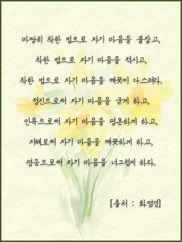 _()_ 붓다의 말씀 2022년 3월 - 마땅히 착한 법으로 자기 마음을 붙잡고 페이지 정보 작성자 정암사 작성일22-02-25 12:00 조회9,136회 댓글0건 본문 . 댓글목록 등록된 댓글이 없습니다. 이전글 다음글 목록