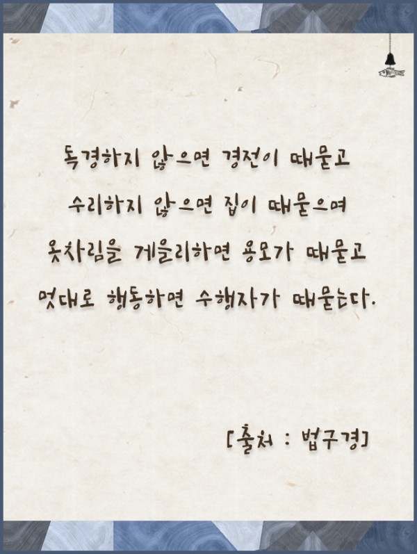 _()_ 붓다의 말씀 2020년 1월 - 독경하지 않으면 경전이 때묻고 페이지 정보 작성자 정암사 작성일19-12-26 15:00 조회10,913회 댓글0건 본문 댓글목록 등록된 댓글이 없습니다. 이전글 다음글 목록