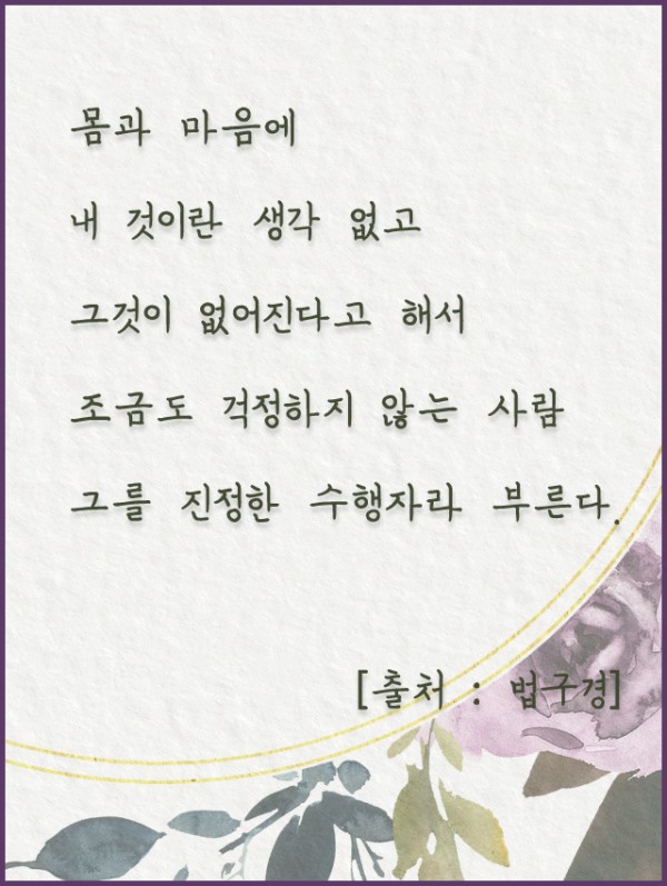 _()_ 붓다의 말씀 2020년 9월 - 몸과 마음에 내 것이란 생각 없고 페이지 정보 작성자 정암사 작성일20-08-25 15:22 조회10,874회 댓글0건 본문 . 댓글목록 등록된 댓글이 없습니다. 이전글 다음글 목록
