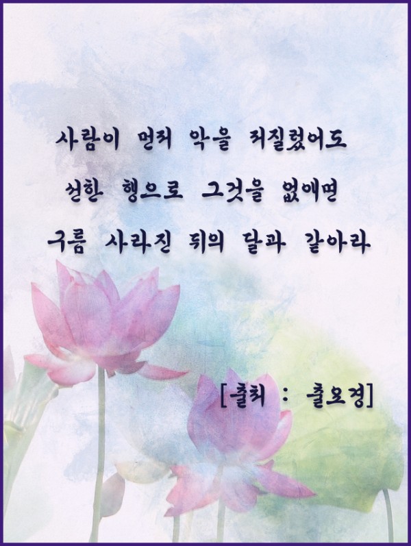 _()_ 붓다의 말씀 2019년 8월 - 사람이 먼저 악을 저질렀어도 페이지 정보 작성자 정암사 작성일19-07-29 16:51 조회10,508회 댓글0건 본문 댓글목록 등록된 댓글이 없습니다. 이전글 다음글 목록