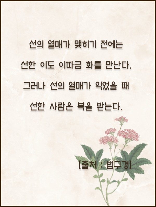 _()_ 붓다의 말씀 2019년 9월 - 선의 열매가 맺히기 전에는 페이지 정보 작성자 정암사 작성일19-08-29 13:59 조회10,403회 댓글0건 본문 댓글목록 등록된 댓글이 없습니다. 이전글 다음글 목록