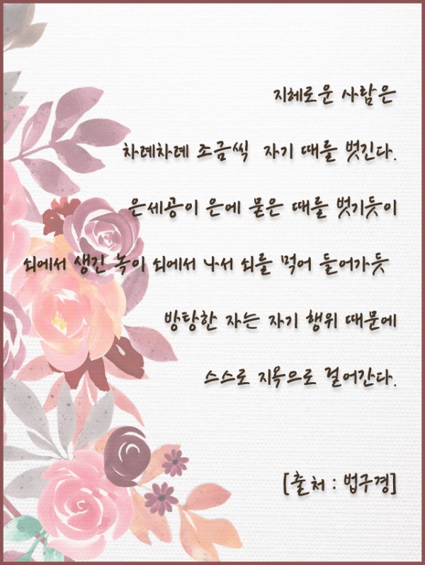 _()_ 붓다의 말씀 2019년 11월 - 지혜로운 사람은 차례차례 조금씩 페이지 정보 작성자 정암사 작성일19-10-29 16:57 조회10,485회 댓글0건 본문 댓글목록 등록된 댓글이 없습니다. 이전글 다음글 목록