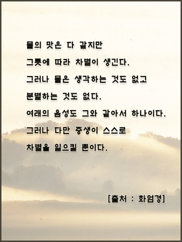 _()_ 붓다의 말씀 2018年 2月 - 물의 맛은 다 같지만 그릇에 따라 차별이 생긴다 페이지 정보 작성자 정암사 작성일18-01-30 13:42 조회11,140회 댓글0건 본문 댓글목록 등록된 댓글이 없습니다. 이전글 다음글 목록