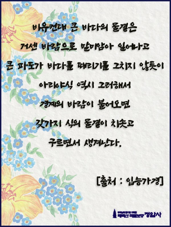 _()_ 붓다의 말씀 2025년 3월 - 비유컨대 큰 바다의 물결은 페이지 정보 작성자 정암사 작성일25-02-28 20:48 조회4,664회 댓글0건 본문 . 댓글목록 등록된 댓글이 없습니다. 이전글 다음글 목록