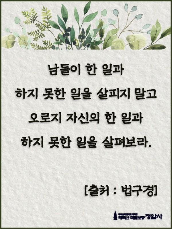 _()_ 붓다의 말씀 2025년 4월 - 남들이 한 일과 하지 못한 일을 살피지 말고 페이지 정보 작성자 정암사 작성일25-03-30 16:15 조회4,868회 댓글0건 본문 . 댓글목록 등록된 댓글이 없습니다. 이전글 다음글 목록