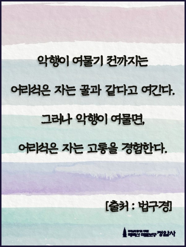 _()_ 붓다의 말씀 2025년 11월 - 악행이 여물기 전까지는 페이지 정보 작성자 정암사 작성일25-10-30 19:25 조회1,936회 댓글0건 본문 . 댓글목록 등록된 댓글이 없습니다. 이전글 다음글 목록