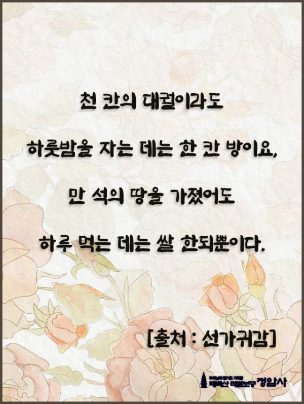 _()_ 붓다의 말씀 2025년 12월 - 천 칸의 대궐이라도 하룻밤을 자는 데는 페이지 정보 작성자 정암사 작성일25-11-28 09:12 조회1,069회 댓글0건 본문 . 댓글목록 등록된 댓글이 없습니다. 이전글 다음글 목록