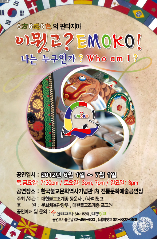 이뭣고∘EMOKO는 글로벌화하는 세계의 무대에서 대한민국 역사의 근간을 이루는 불교문화를 선양하고 청소년을 비롯한 계층포교를 위해 창단된 퍼포먼스 공연단으로서 불전 사물 (범종, 법고, 목어, 운판)을 소재로 스님과 전문 배우들로 구성된 세계 유일의 불전 사물 타악 퍼포먼스 공연단입니다.