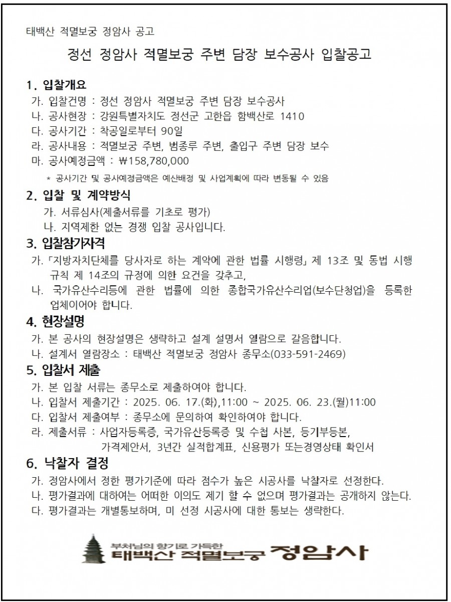 정선 정암사 적멸보궁 주변 담장 보수공사 입찰공고 페이지 정보 작성자 정암사 작성일25-06-16 09:30 조회3,473회 댓글0건 본문 . 댓글목록 등록된 댓글이 없습니다. 이전글 다음글 목록
