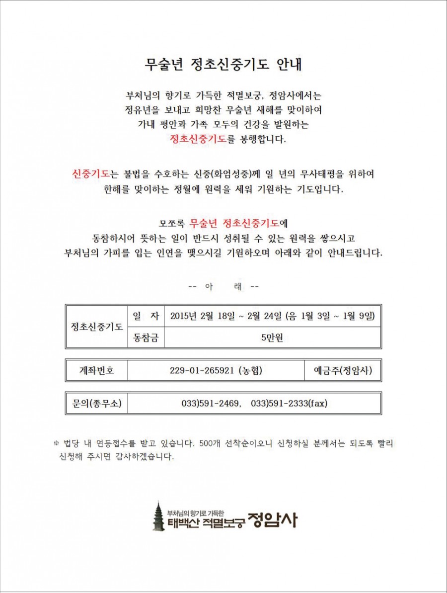 무술년 정초신중기도 봉행 페이지 정보 작성자 정암사 작성일18-01-05 12:21 조회10,300회 댓글0건 본문 * 클릭하시면 확대해서 보실 수 있습니다. 댓글목록 등록된 댓글이 없습니다. 이전글 다음글 목록