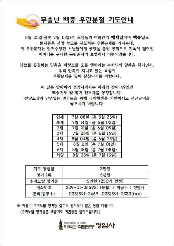 무술년 백중 우란분절 기도 봉행 > 공지사항