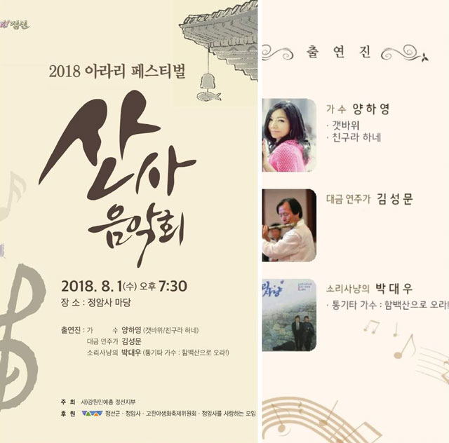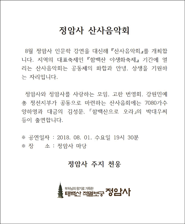 『 정암사 산사음악회』_8월 1일(수) 19시 30분 정암사 마당 페이지 정보 작성자 정암사 작성일18-07-16 12:45 조회9,635회 댓글0건 본문 . 댓글목록 등록된 댓글이 없습니다. 이전글 다음글 목록