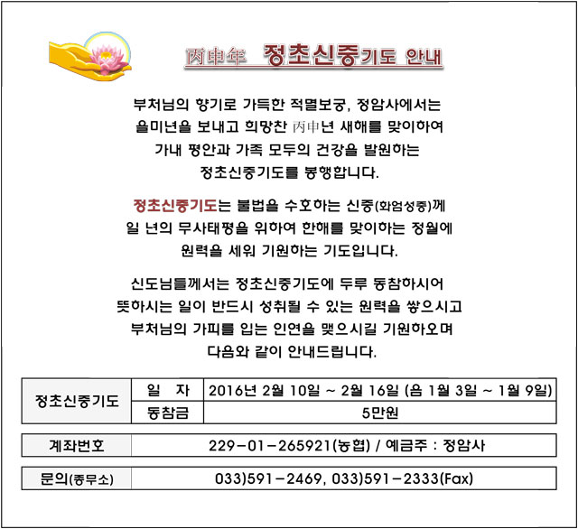 불기2560(2016)년 정초신중기도 봉행 페이지 정보 작성자 정암사 작성일15-12-22 21:01 조회10,438회 댓글0건 본문 . 댓글목록 등록된 댓글이 없습니다. 이전글 다음글 목록