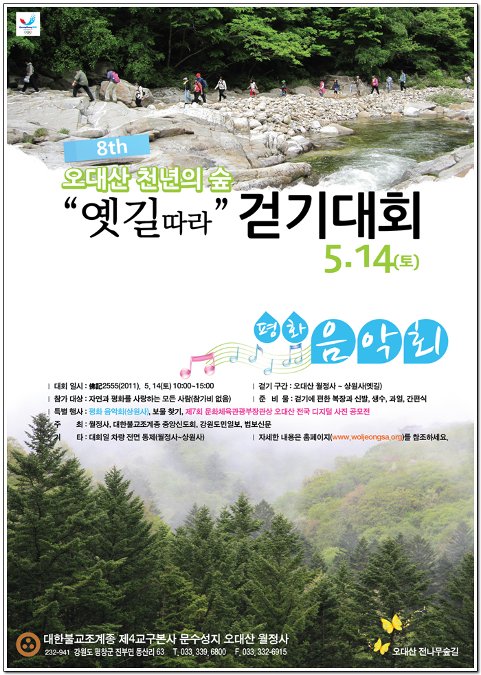오대산 천년의 숲 옛길따라 걷기대회 - 5월 14일 페이지 정보 작성자 정암사 작성일11-04-07 09:04 조회11,589회 댓글0건 본문 발밑으로 전해져 오는 오대산 숲길의 포근함을 함께해요... 댓글목록 등록된 댓글이 없습니다. 이전글 다음글 목록