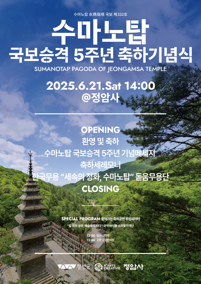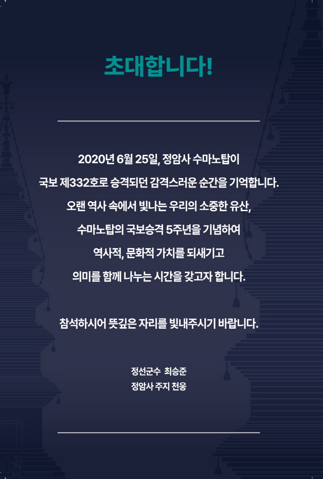 수마노탑 국보승격 5주년 축하기념식에 초대합니다(25.06.21,토) 페이지 정보 작성자 정암사 작성일25-05-20 14:43 조회7,710회 댓글0건 본문 댓글목록 등록된 댓글이 없습니다. 이전글 다음글 목록