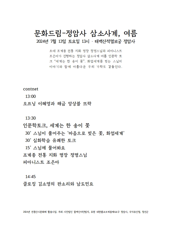 문화드림 - 정암사 삼소사계, 여름 페이지 정보 작성자 정암사 작성일24-07-07 10:36 조회4,719회 댓글0건 본문 . 댓글목록 등록된 댓글이 없습니다. 이전글 다음글 목록