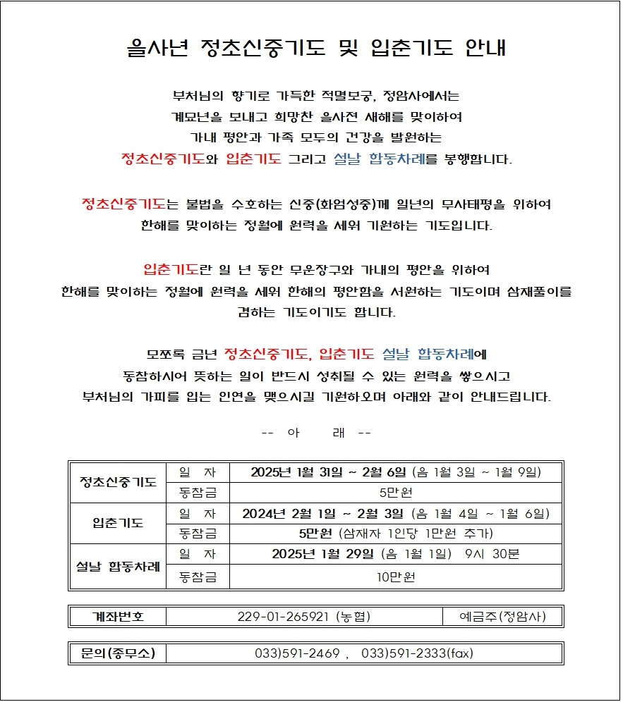 을사년 정초신중기도 및 입춘기도 봉행 페이지 정보 작성자 정암사 작성일24-12-26 09:36 조회4,981회 댓글0건 본문 . 댓글목록 등록된 댓글이 없습니다. 이전글 다음글 목록
