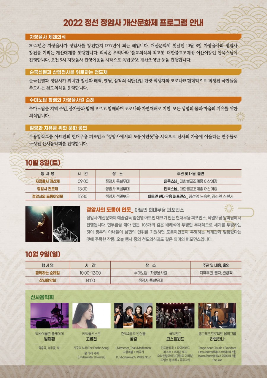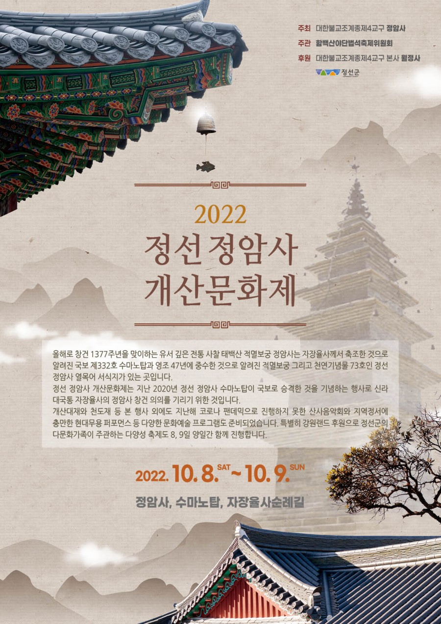2022 정선 정암사 개산문화제_2022.10.8~10.9 페이지 정보 작성자 정암사 작성일22-09-16 09:55 조회7,331회 댓글0건 본문 . 댓글목록 등록된 댓글이 없습니다. 이전글 다음글 목록