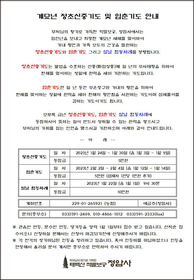 계묘년 정초신중기도 및 입춘기도 봉행 페이지 정보 작성자 정암사 작성일22-12-31 09:58 조회6,907회 댓글0건 본문 . 댓글목록 등록된 댓글이 없습니다. 이전글 다음글 목록