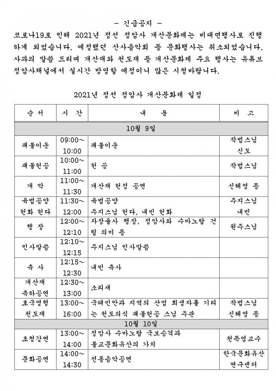[긴급공지] 2021년 정선정암사 개산문화제 변경안내 페이지 정보 작성자 정암사 작성일21-10-04 13:00 조회9,065회 댓글0건 본문 #정암사, #적멸보궁, #수마노탑, #조계종 댓글목록 등록된 댓글이 없습니다. 이전글 다음글 목록