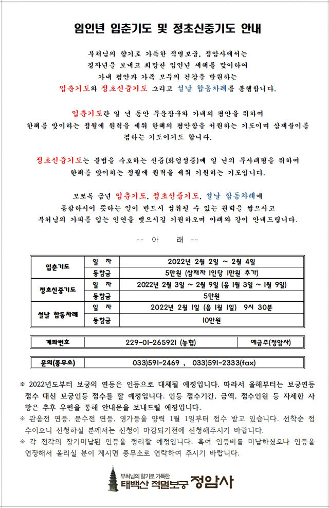 임인년 입춘기도 및 정초신중기도 봉행 페이지 정보 작성자 정암사 작성일22-01-07 17:17 조회9,645회 댓글0건 본문 . 댓글목록 등록된 댓글이 없습니다. 이전글 다음글 목록