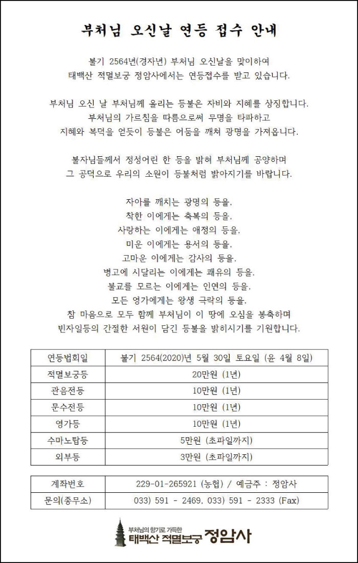 경자년 부처님오신날을 맞아 연등공양 올리세요 페이지 정보 작성자 정암사 작성일20-04-09 10:47 조회11,448회 댓글0건 본문 댓글목록 등록된 댓글이 없습니다. 이전글 다음글 목록