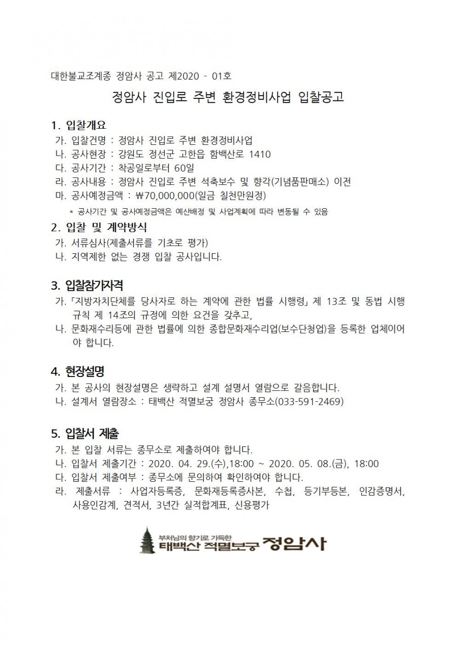 정암사 진입로 주변 환경정비사업 입찰공고 페이지 정보 작성자 정암사 작성일20-04-29 16:52 조회11,004회 댓글0건 본문 적멸보궁 정암사 주변 환경정비사업 입찰공고 댓글목록 등록된 댓글이 없습니다. 이전글 다음글 목록