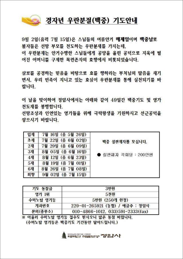 경자년 백중 (우란분절) 기도안내 페이지 정보 작성자 정암사 작성일20-06-13 08:55 조회12,115회 댓글0건 본문 . 댓글목록 등록된 댓글이 없습니다. 이전글 다음글 목록