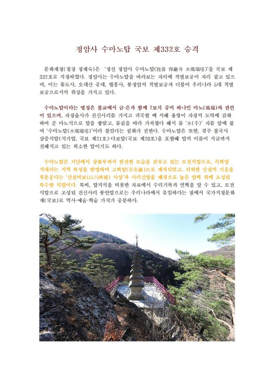 적멸보궁 정암사 수마노탑 국보 제332호 지정 페이지 정보 작성자 정암사 작성일20-06-25 10:50 조회16,019회 댓글0건 본문 적멸보궁 정암사 수마노탑 국보 제 332호 댓글목록 등록된 댓글이 없습니다. 이전글 다음글 목록