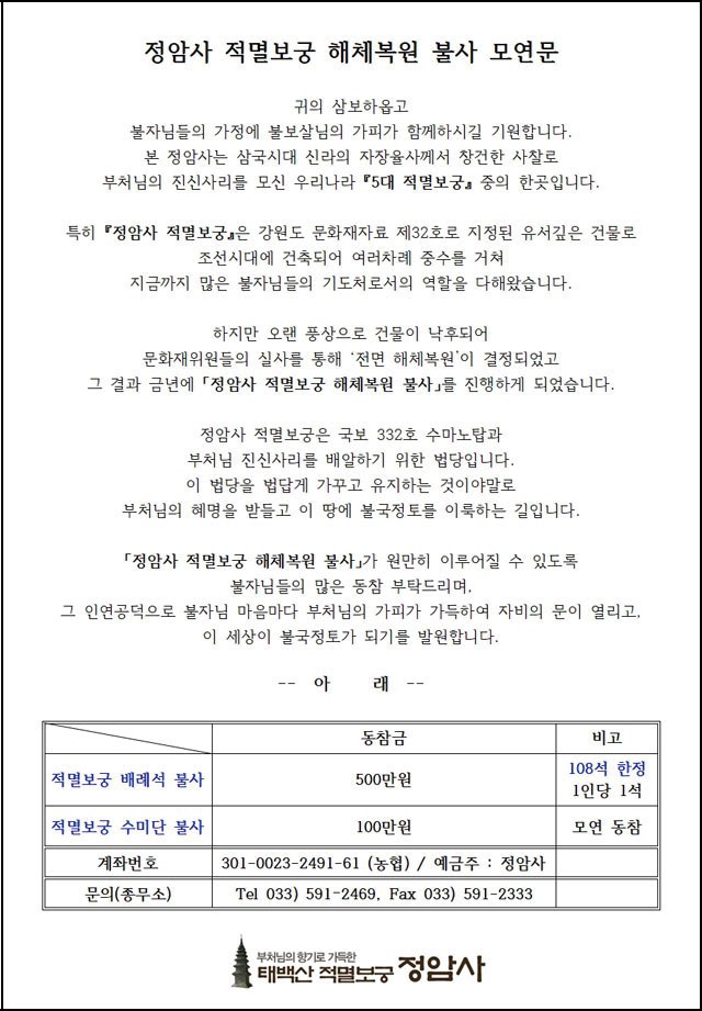 정암사 적멸보궁 해체복원 불사 모연 페이지 정보 작성자 정암사 작성일21-04-12 15:18 조회17,076회 댓글0건 본문 . 댓글목록 등록된 댓글이 없습니다. 이전글 다음글 목록