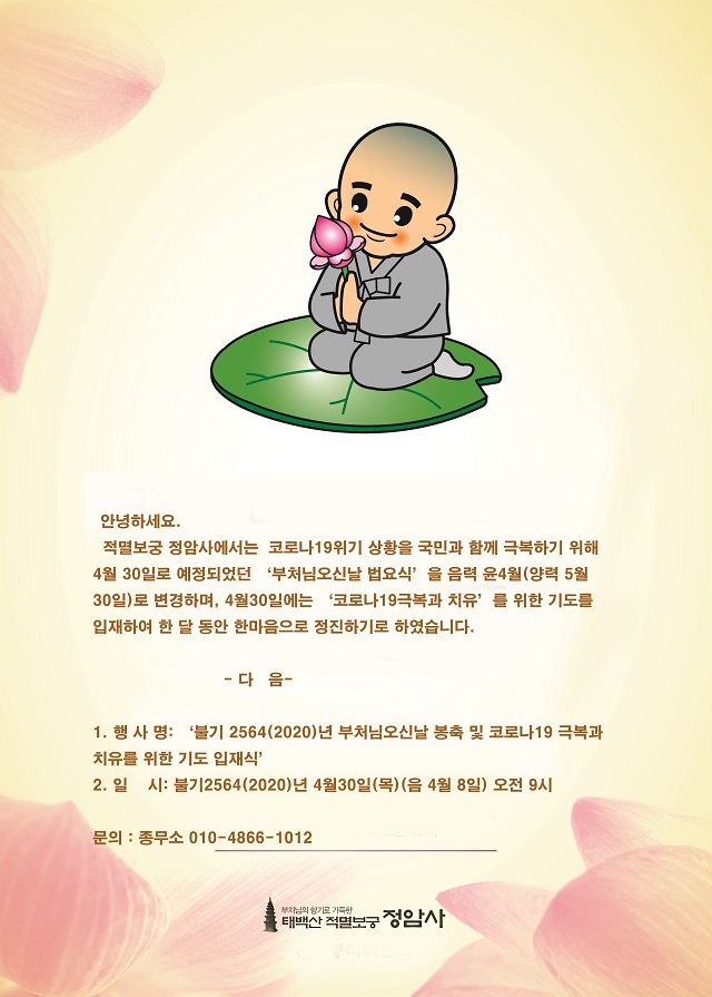 경자년 부처님오신날 봉행 및 기도 입재식 페이지 정보 작성자 정암사 작성일20-04-25 14:59 조회9,922회 댓글0건 본문 댓글목록 등록된 댓글이 없습니다. 이전글 다음글 목록