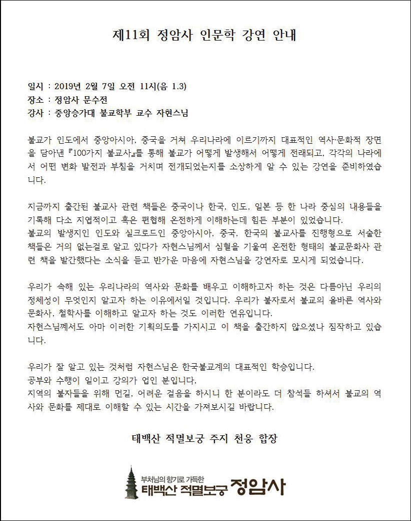 『제11회 정암사 인문학 강연』_2월 7일(음 1.3) 오전 11시 페이지 정보 작성자 정암사 작성일19-01-25 13:08 조회9,409회 댓글0건 본문 . 댓글목록 등록된 댓글이 없습니다. 이전글 다음글 목록