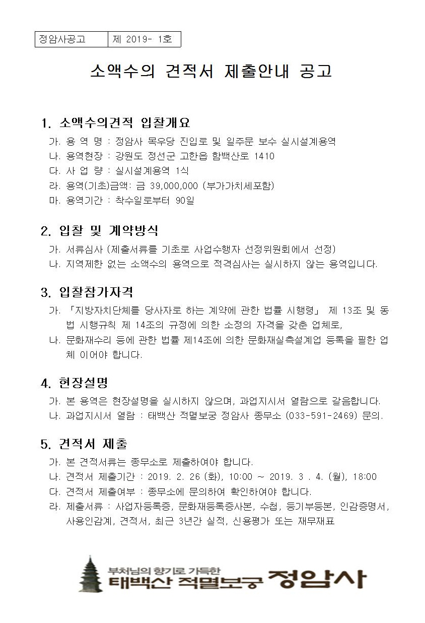 「정암사 목우당 진입로 및 일주문보수공사 설계용역」견적서 제출 공고(첨부파일 참조)