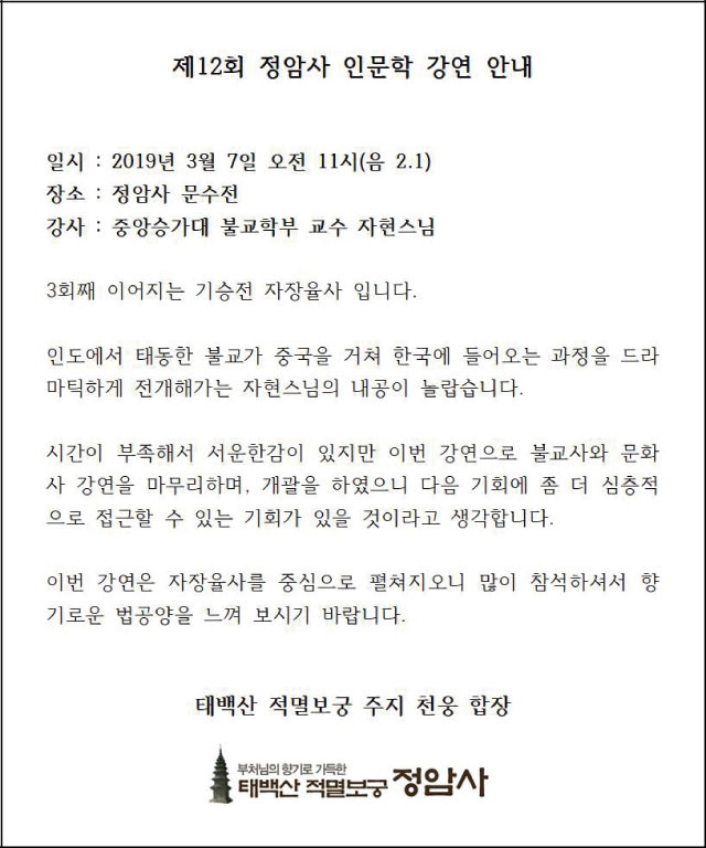 『제12회 정암사 인문학 강연』_3월 7일(음 2.1) 오전 11시 페이지 정보 작성자 정암사 작성일19-03-03 13:41 조회9,498회 댓글0건 본문 . 댓글목록 등록된 댓글이 없습니다. 이전글 다음글 목록