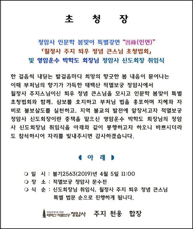 『월정사 주지 퇴우 정념 큰스님 초청법회』 및 『신도회장 취임식』_4월 5일 페이지 정보 작성자 정암사 작성일19-03-22 15:57 조회9,489회 댓글0건 본문 . 댓글목록 등록된 댓글이 없습니다. 이전글 다음글 목록
