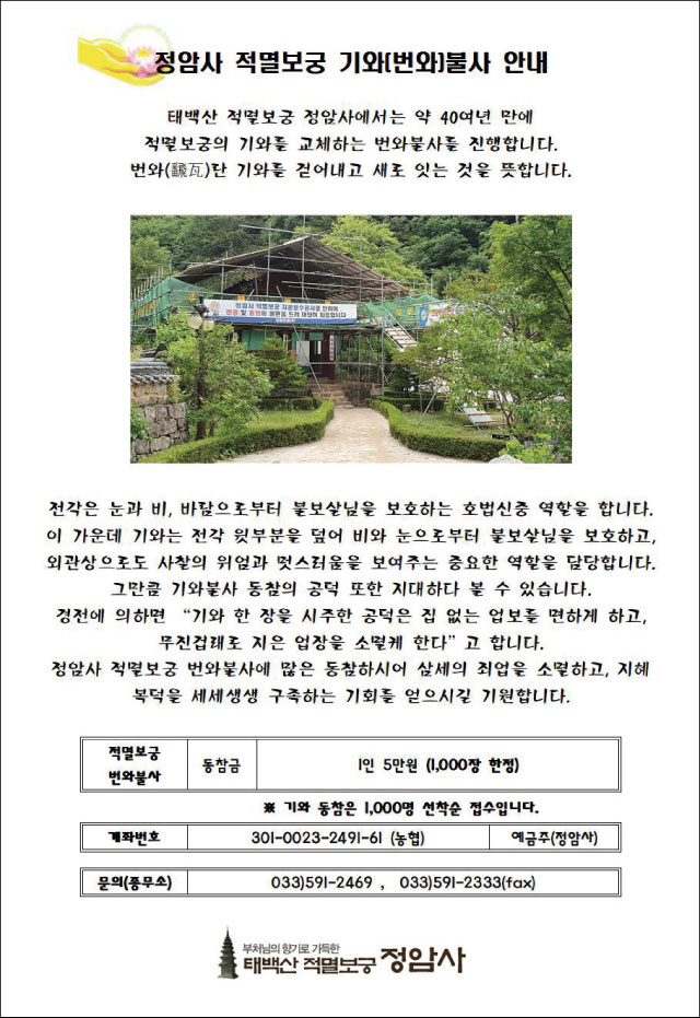 보궁 번와 불사 및 공양간 진입로 불사 봉행 페이지 정보 작성자 정암사 작성일19-05-21 12:27 조회10,043회 댓글0건 본문 . 댓글목록 등록된 댓글이 없습니다. 이전글 다음글 목록