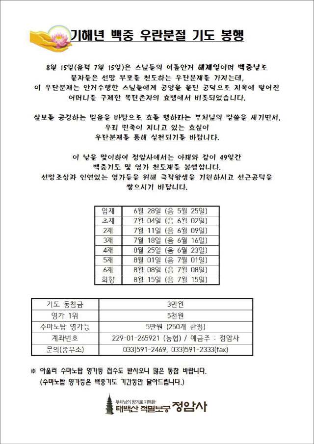 기해년 백중 우란분절기도 봉행 > 공지사항