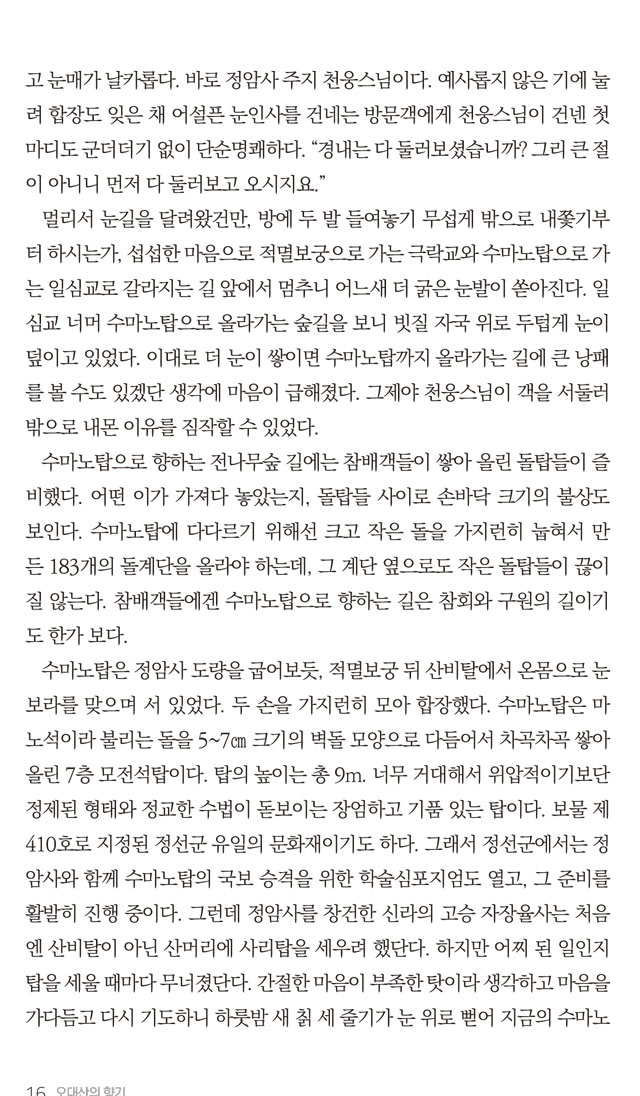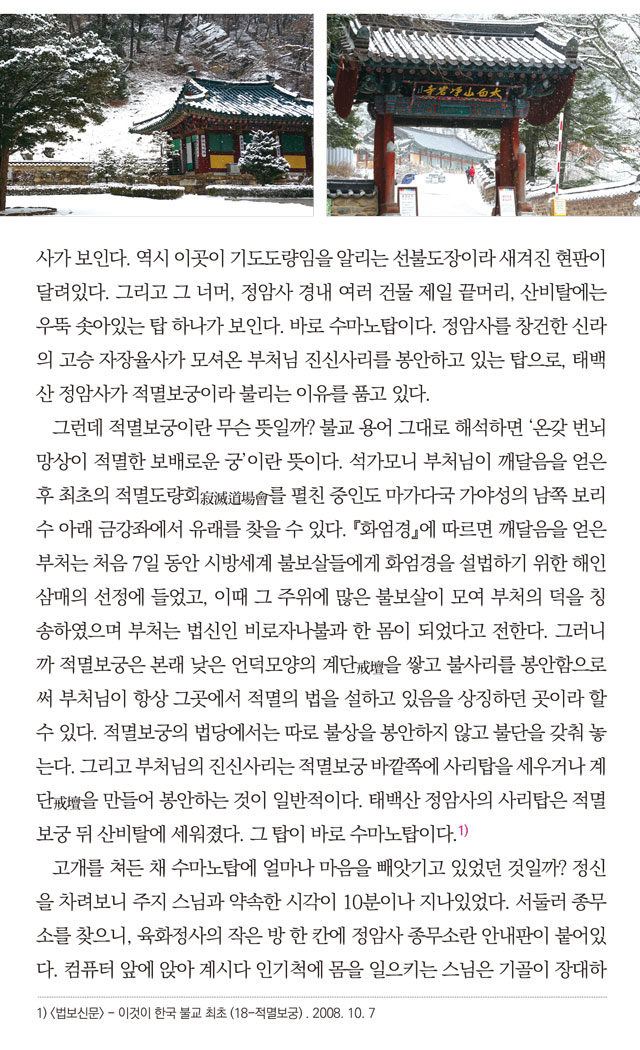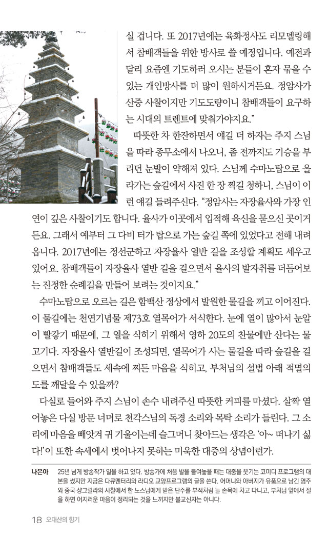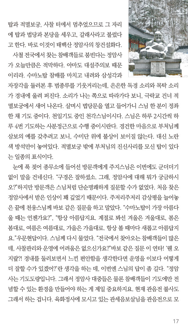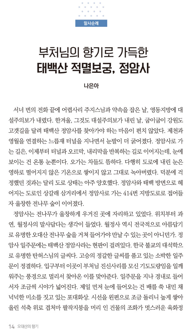 오대산향기 1월호 말사순례_부처님의 향기로 가득한 태백산 적멸보궁 정암사 페이지 정보 작성자 정암사 작성일17-01-18 13:57 조회10,960회 댓글0건 본문 . 댓글목록 등록된 댓글이 없습니다. 이전글 다음글 목록