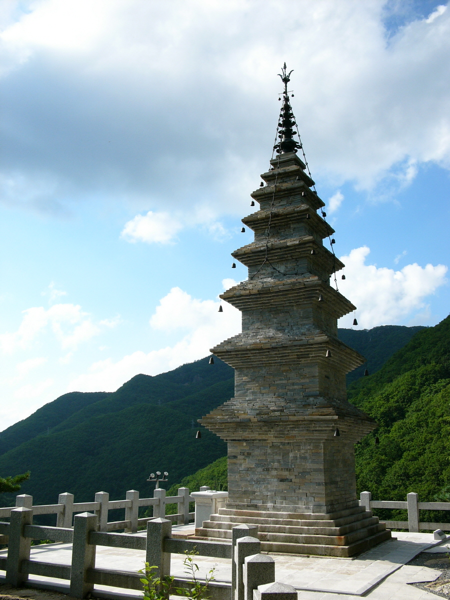 다시 나와 산 중턱을 바라보면 꿈처럼 보이는 석탑이 있다. 이 석탑은 보물 제410호로 지정돼 있다. 탑으로 올라 가려면 적멸보궁 오른편으로 난 비탈을 찾아 계단을 따라 200미터 이상을 올라야 한다. 계단이 겹겹으로 놓여지고 가파른 산길이라 좌우로 지현자를 그리며 만들어져 있다.